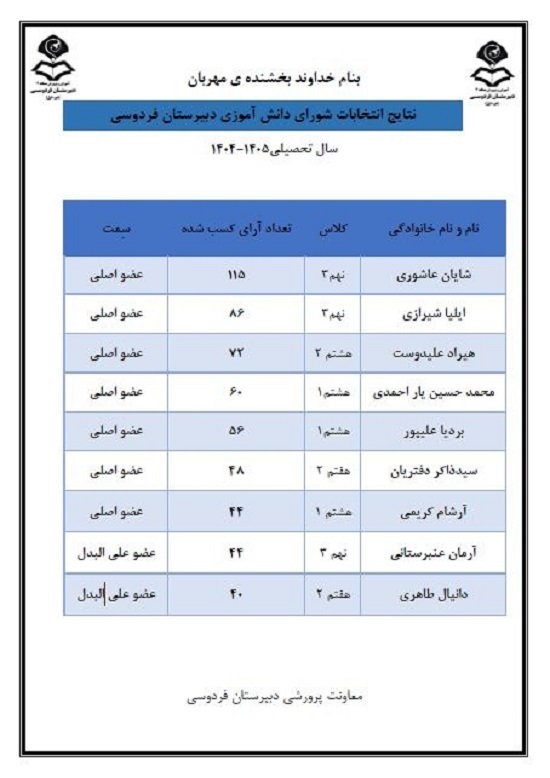 - نتیجه انتخابات شورای دانش آموزی 1404
