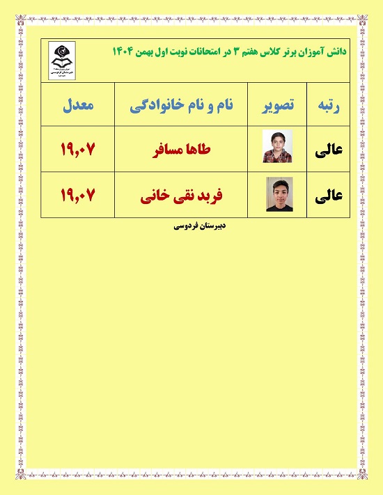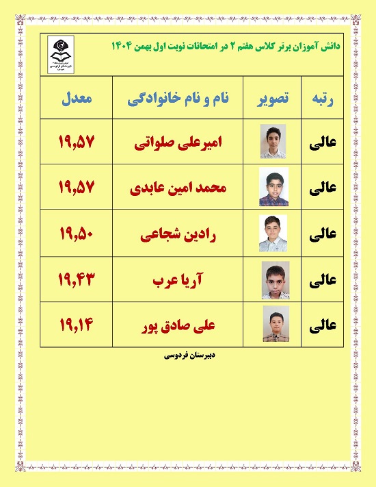 - رتبه های برتر پایه هفتم در امتحانات ترم یک بهمن 1404