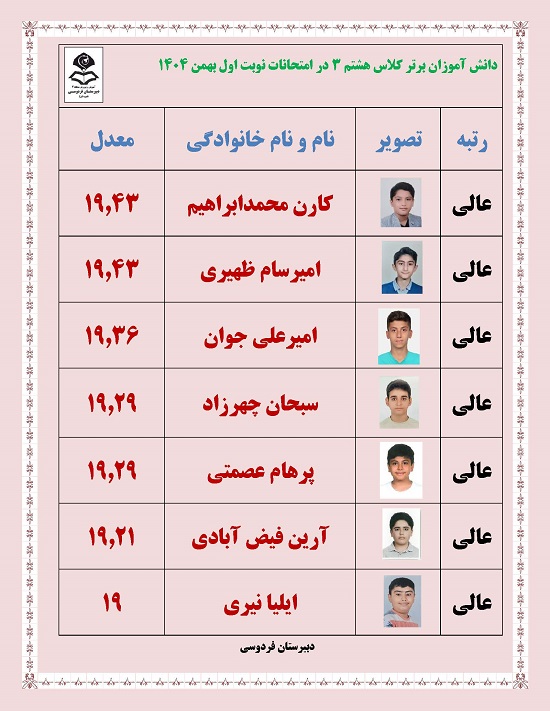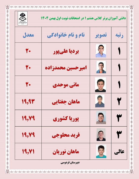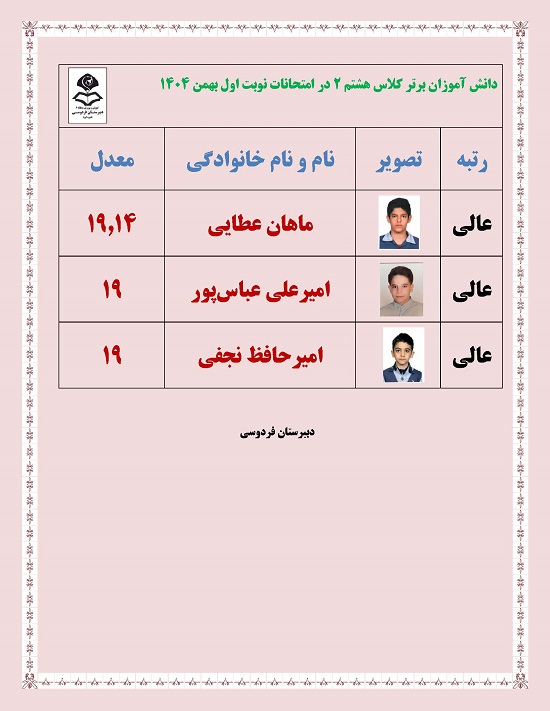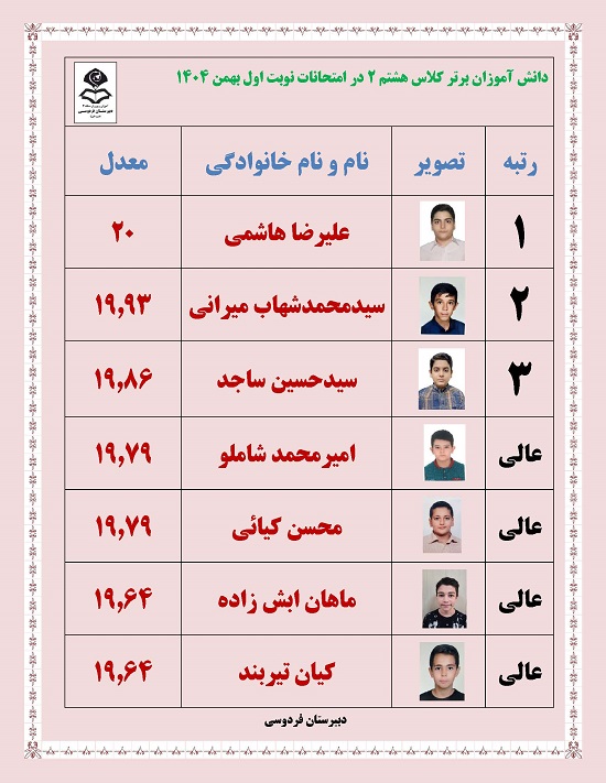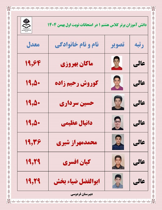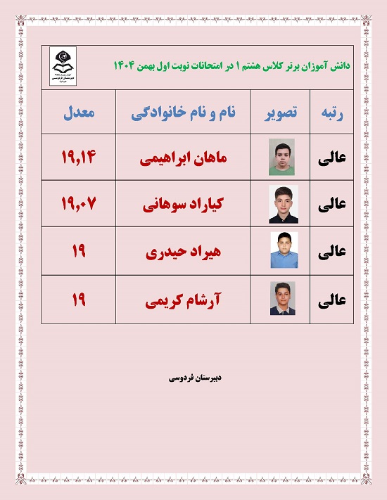 - رتبه های برتر پایه هشتم در امتحانات ترم یک بهمن 1404