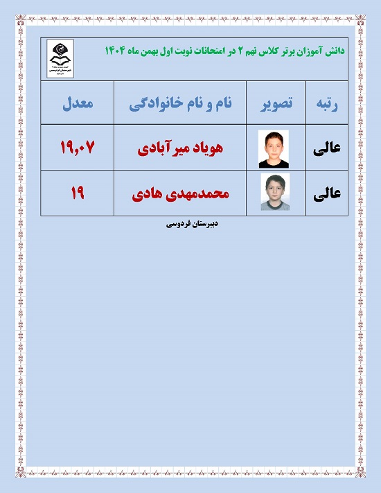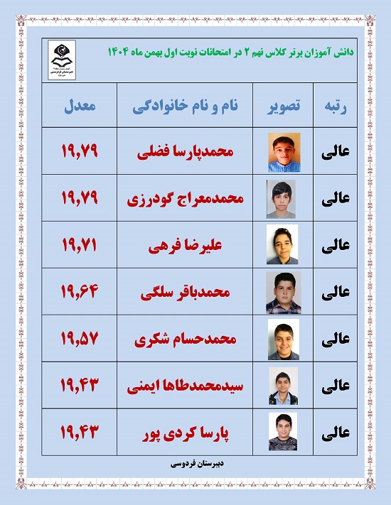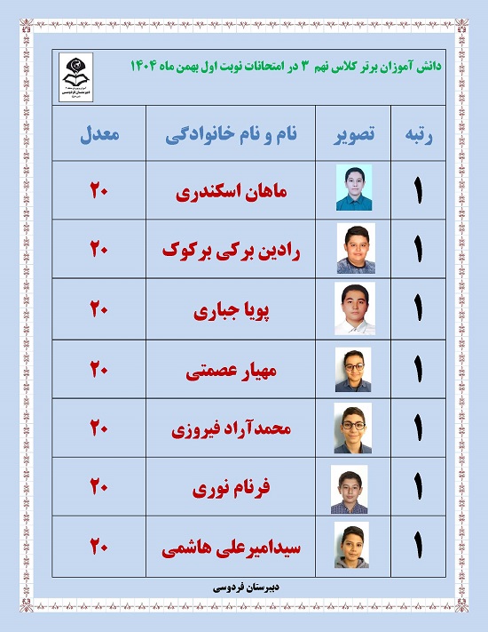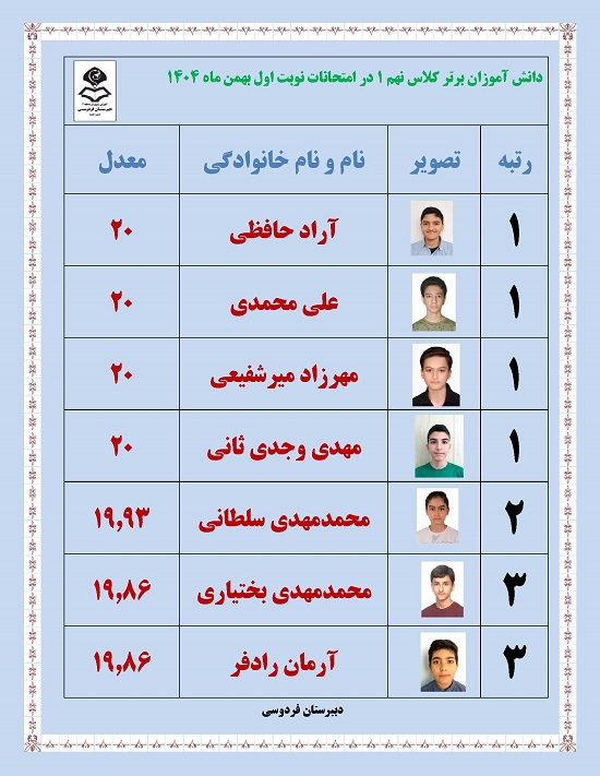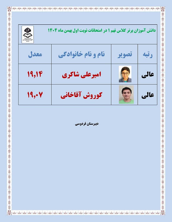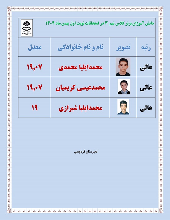 - رتبه های برتر پایه نهم در امتحانات ترم یک بهمن 1404