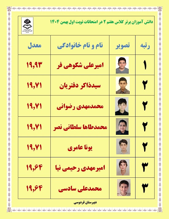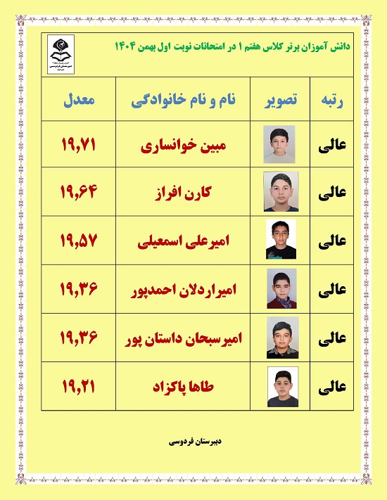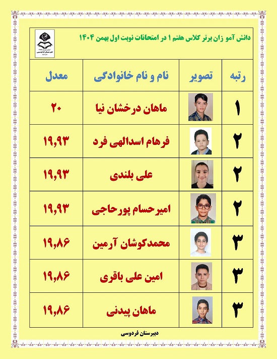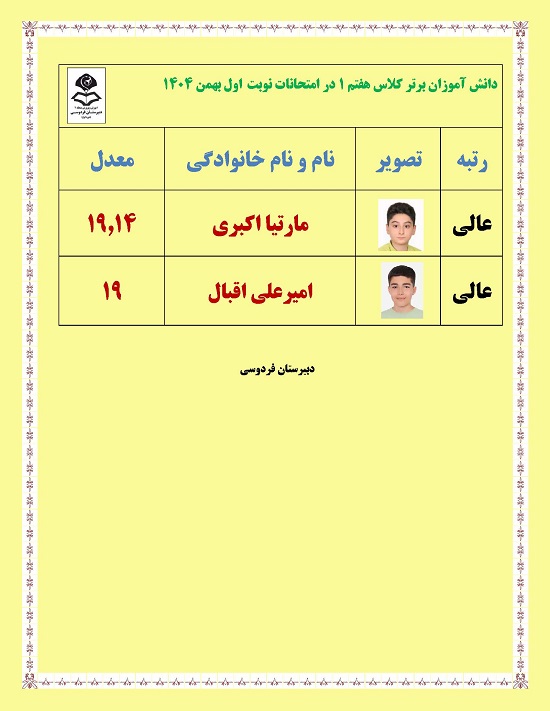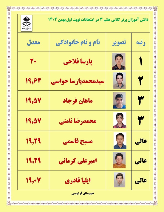 - رتبه های برتر پایه هفتم در امتحانات ترم یک بهمن 1404