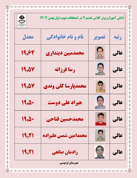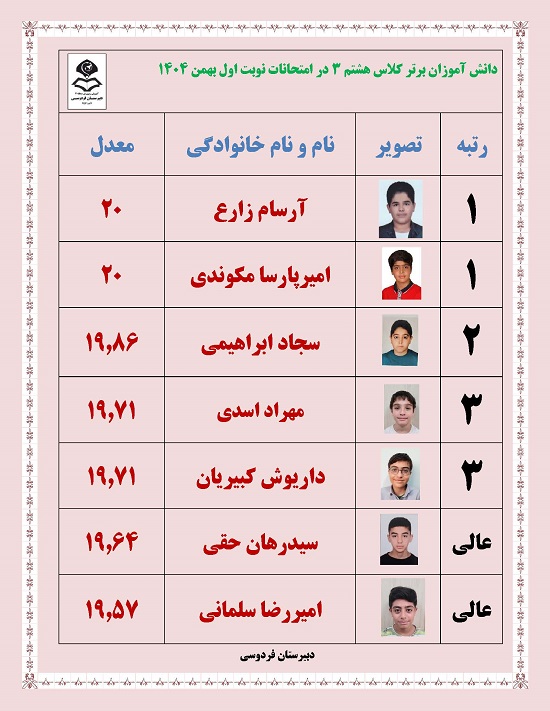 - رتبه های برتر پایه هشتم در امتحانات ترم یک بهمن 1404