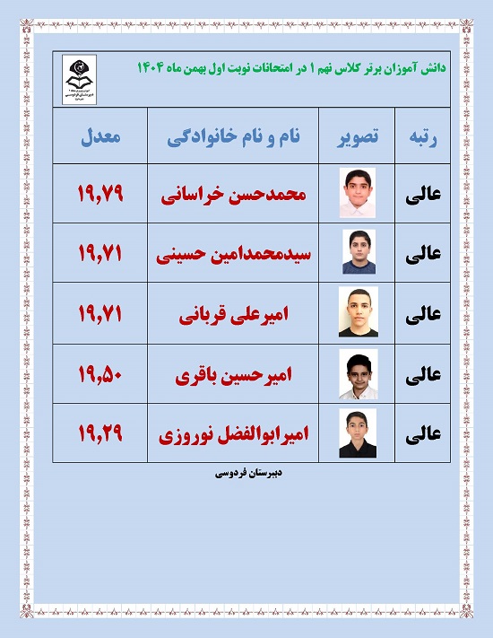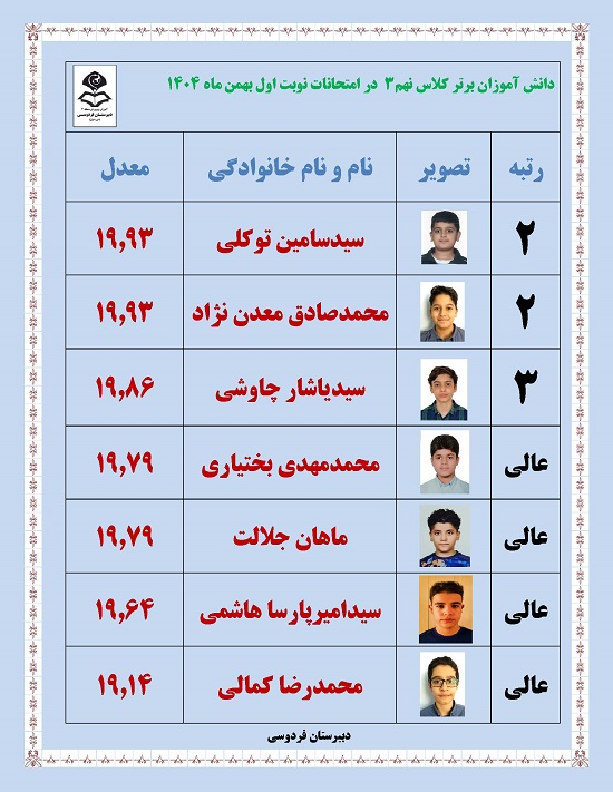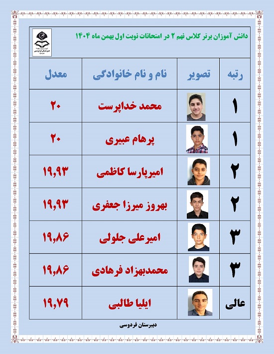 - رتبه های برتر پایه نهم در امتحانات ترم یک بهمن 1404